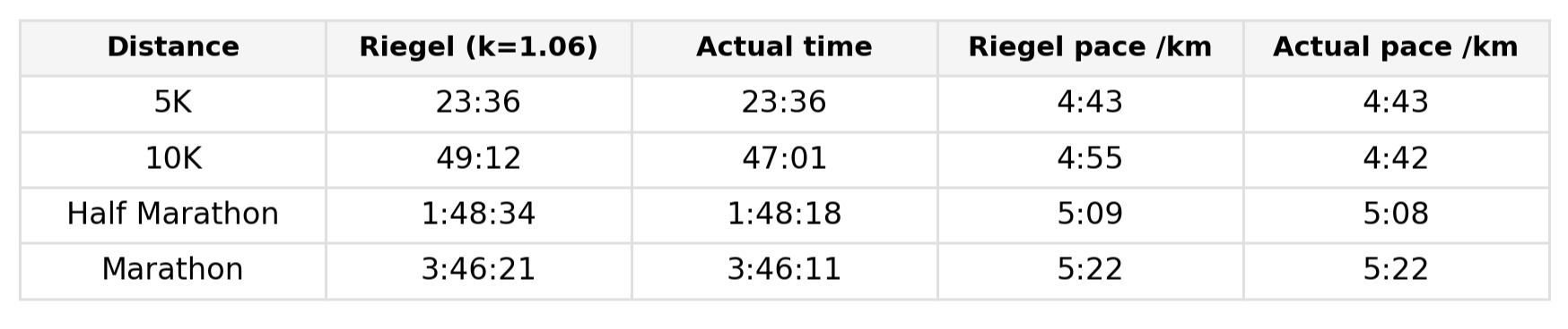 Using my 5K time as the starting point, this is how the Riegel method predicted my 10K, half marathon and marathon times compared to what I actually ran. Aside from a freakishly fast 10K, which I’m putting down to a good day and zero pressure, the longer distances lined up remarkably well.